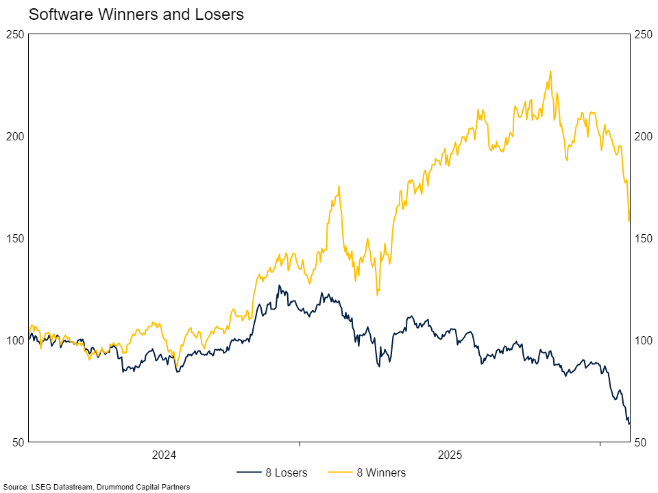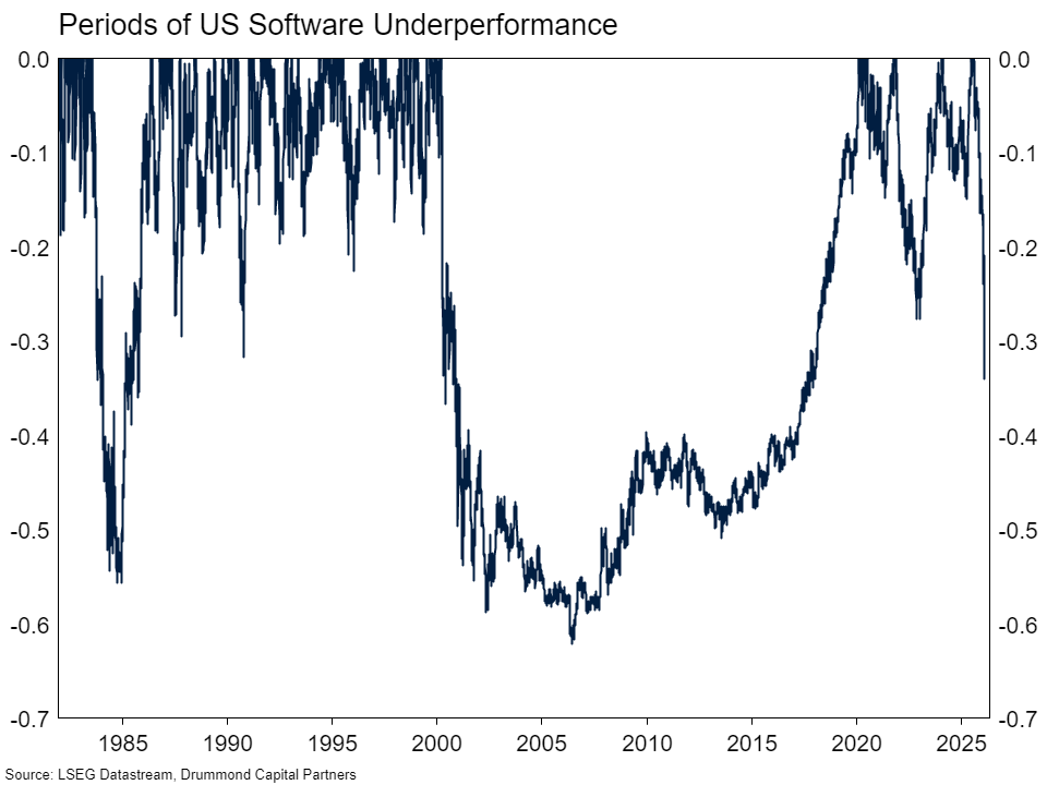 The software panic thesis is as follows. Because individuals and corporations can build software internally easily using AI, SaaS as a business model is dead. Writing as someone who has used Claude Code to build software internally rather than outsourcing its creation, we think that logic only applies to a tiny fraction of the software sector. At an enterprise level, no one is rebuilding Windows to save a few hundred dollars a year. Indeed, if they wanted to save that money they could move their staff to Linux, a free operating system which has been available since the early 1990s. Open Office has been around since 2002 if you want a free version of Excel. There are companies at risk. Software providers that sell expensive software to large organisations (who have their own software development teams), which from a user’s perspective feels like trying to shove a square peg into a round hole, will now find it easier to build the square hole themselves. Start-up software companies will see the “value” of their technology stack dramatically reduced because the cost for the next start-up to replicate it is now much lower. We expect lots of innovation as the cost to develop software continues to collapse.