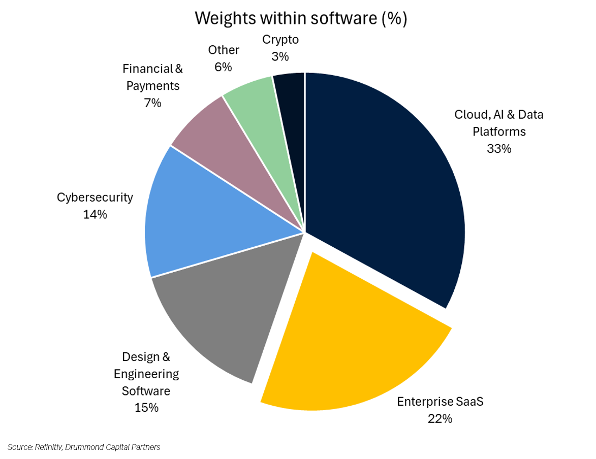 Alongside this, SaaS is only around one quarter of the software sector. Around 60% of the sector is cloud, data, cybersecurity and chip design software. Many of the companies in these categories are clear beneficiaries of AI. AI makes software development cheaper. Any good economist will tell you that supplying more of something makes it cheaper. Cheaper software means more software. More software means more databases, API calls, security checkpoints, compute requests, storage, chips, etc.