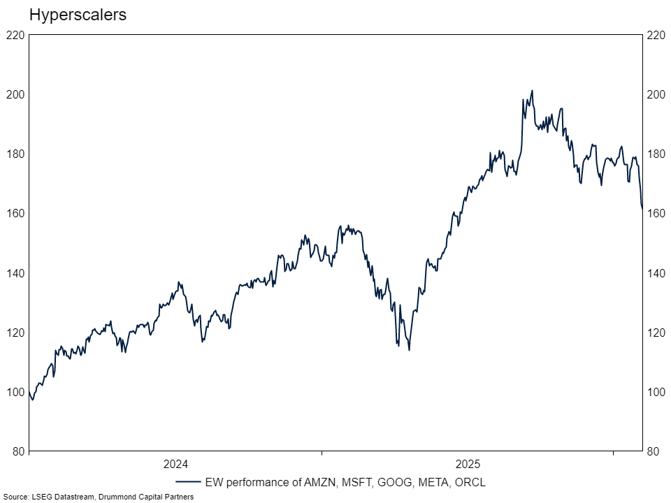 The other technology related drawdown making headlines is the fall in the hyperscalers. An equal-weighted basket of Amazon, Microsoft (which is in the software sector above), Meta, Alphabet and Oracle is down around 20% since September. The market is concerned that these companies are taking the hyper in their hyperscaler too literally with regards to capex.