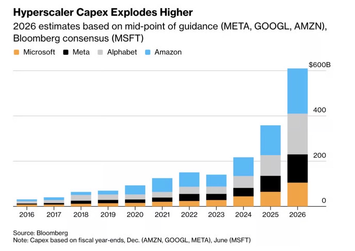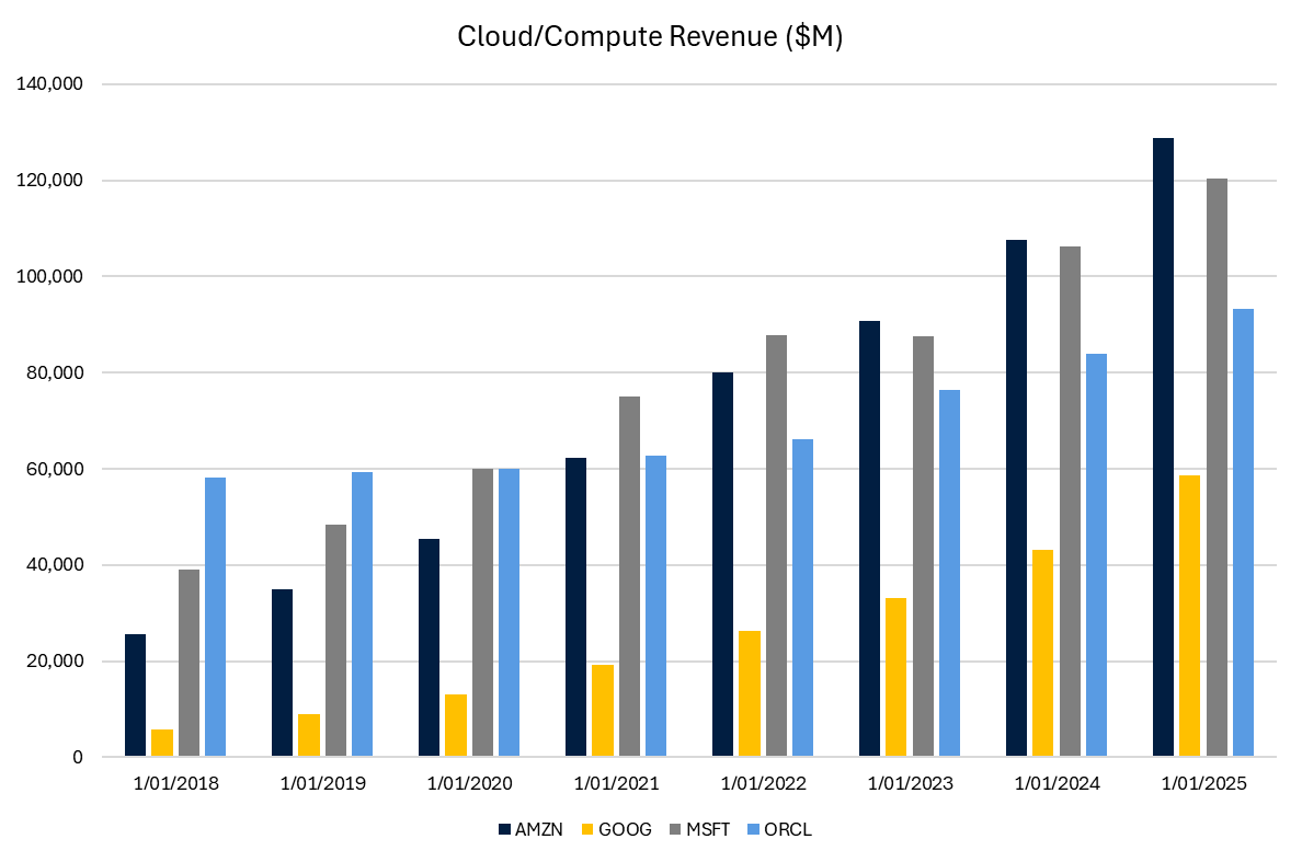 They may be correct, they may be incorrect. It’s probably the biggest question overhanging markets and may remain unresolved for years. We know two things. Proposed capex is extremely high, planned at ~$600 billion this year, three times higher than 2024. It may go higher from there. Additionally, the revenue these companies have been generating from selling cloud computing has also been rising at an exceptional pace. Meta is excluded. They are a hyperscaler which doesn’t sell their compute. More AI and more software means more compute is needed. Almost certainly cloud computing revenue will continue to rise, but whether the whole exercise will be profitable remains to be seen. Historically, companies have tended to overinvest in production in boom time environments, oversupplying the market and causing an inevitable downturn. Perhaps AI is different.