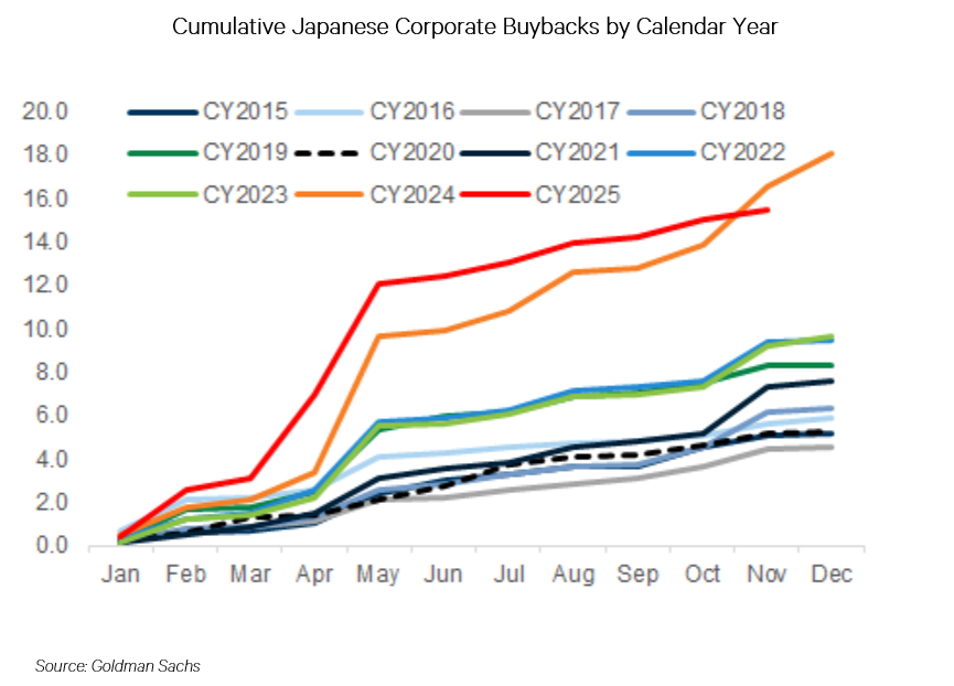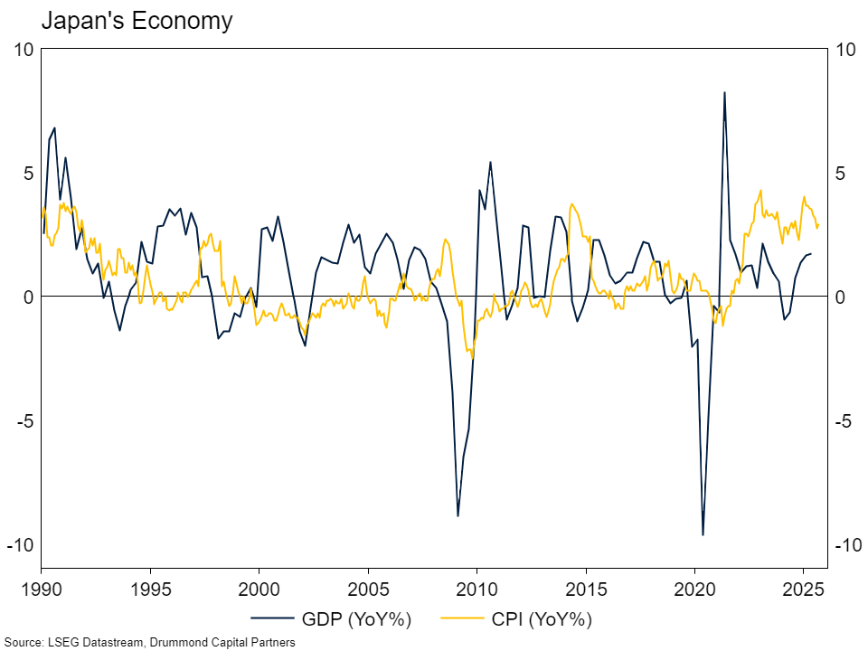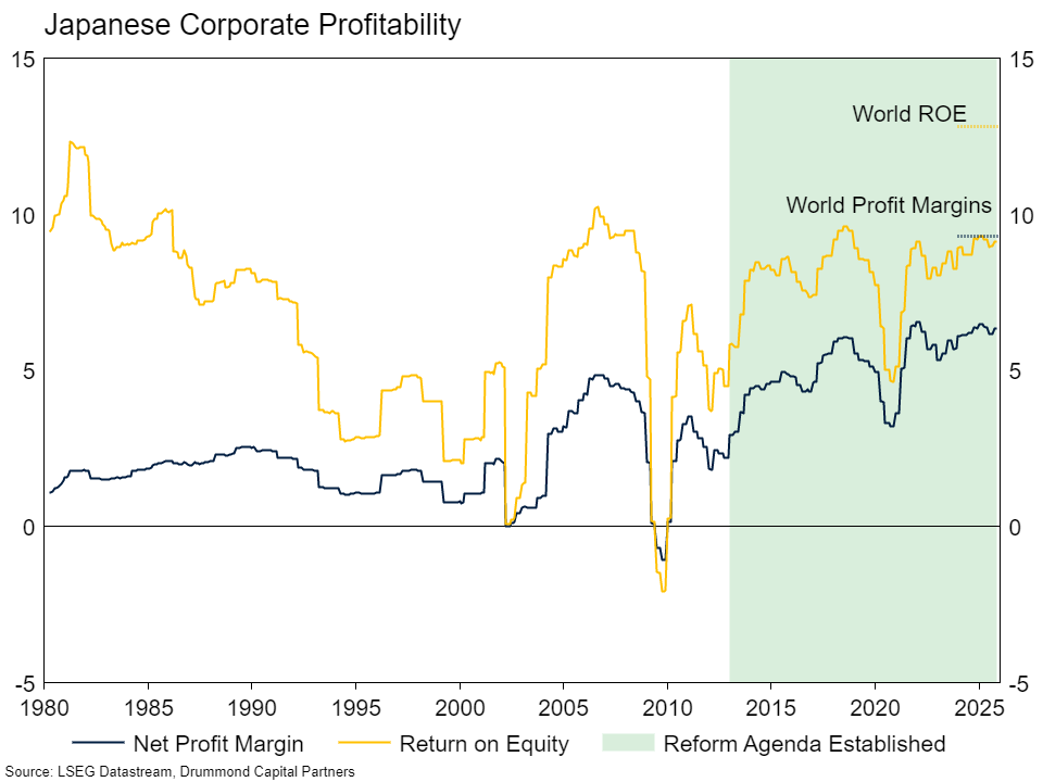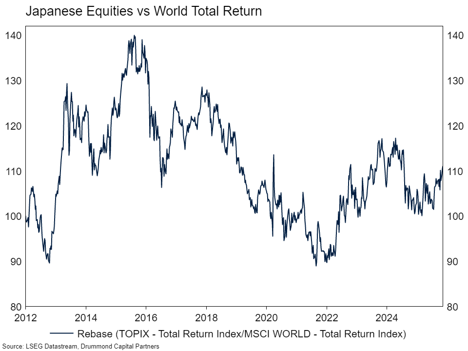 Abenomics was introduced by Prime Minister Shinzo Abe in 2012 and was an economic revival strategy designed to end Japan's two-decade deflationary spiral through "three arrows" of coordinated policy intervention. The first arrow involved aggressive monetary easing by the Bank of Japan, including negative interest rates and massive asset purchases. The second arrow deployed fiscal stimulus through increased government spending on infrastructure. The third arrow promised structural reforms to boost productivity and competitiveness, including labour market liberalisation, corporate tax cuts and corporate governance reform. Abe resigned as Prime Minister in 2020 and has been succeeded by a number of leaders of varying degrees of market friendliness. However, the October 2025 appointment of Sanae Takaichi (an Abe protégé) as Prime Minister (albeit leading a minority government) has reignited investor hopes for Japanese equities.