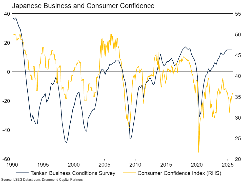 High inflation and rising interest rates have weighed on Japanese consumer confidence (see below). However, a weaker Yen and an inflationary environment have delivered pricing power to Japanese corporates. This, combined with the ongoing reform agenda has seen business confidence return to multi-decade highs.